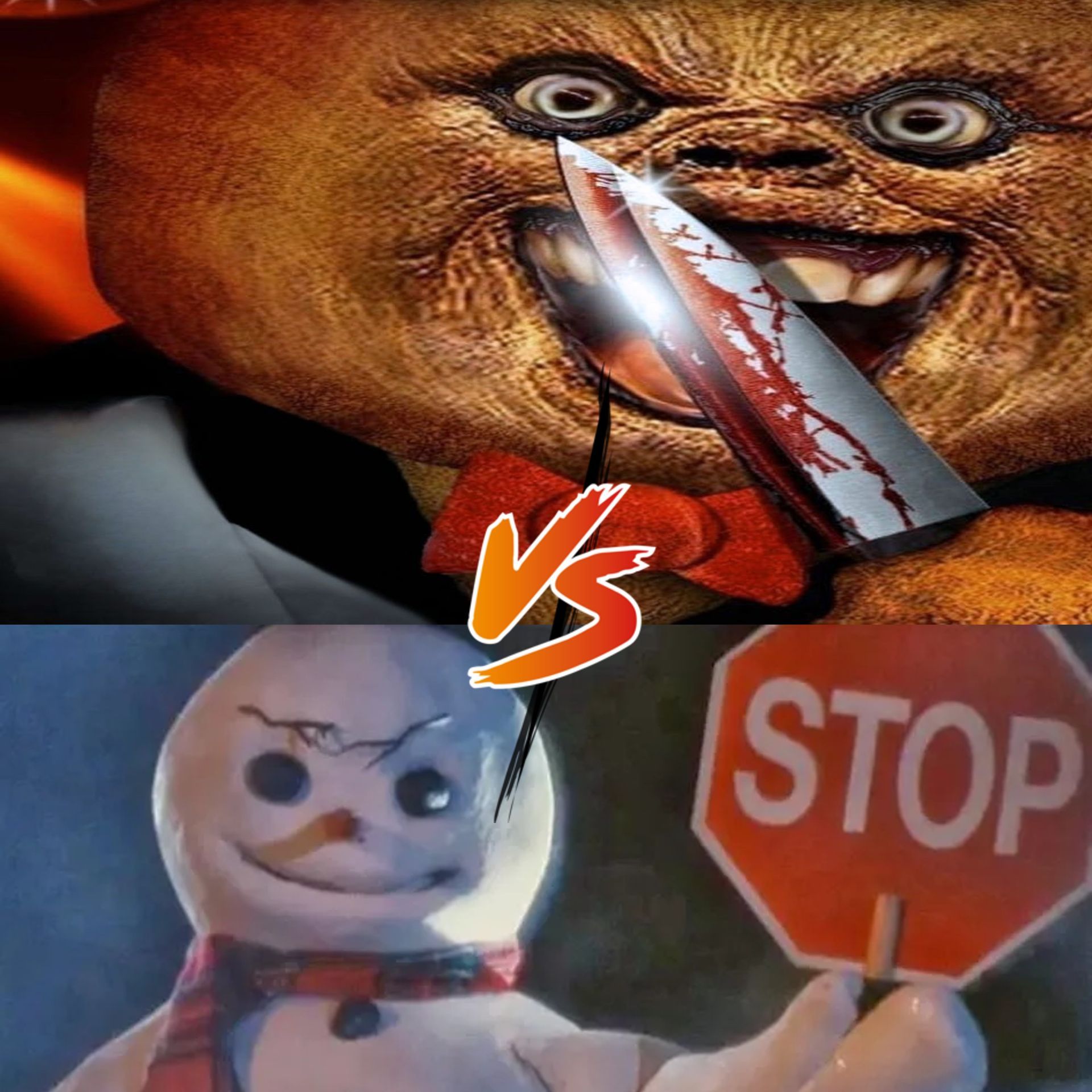 Title: Frostbite: A Christmas Confrontation INT. SKI LODGE - NIGHT The scene opens on a cozy, picturesque ski lodge decorated for Christmas. The lodge is bustling with holiday cheer. A Christmas tree glows warmly in the corner, and carolers can be heard singing outside. The camera pans to a sign on the wall: "WELCOME TO WINTER HAVEN SKI LODGE". CUT TO: INT. KITCHEN - NIGHT The kitchen is busy with staff preparing a Christmas feast. We focus on a tray of freshly baked gingerbread men cooling on the counter. Suddenly, the room temperature drops dramatically. Frost forms on the windows. One of the gingerbread men begins to twitch and move, growing larger and more menacing until it becomes the GINGERDEAD MAN, his icing forming a sinister grin. GINGERDEAD MAN (laughing maniacally) Time to spice things up! CUT TO: EXT. SKI LODGE - NIGHT Outside, a fierce snowstorm is brewing. The snow begins to swirl unnaturally, coalescing into the shape of a menacing snowman with jagged icicles for teeth and coal-black eyes. This is JACK FROST, THE MUTANT KILLER SNOWMAN. JACK FROST (growling) There’s only room for one holiday horror around here... INT. SKI LODGE - LOBBY - NIGHT Guests are mingling, sipping hot cocoa, and enjoying the warmth of the fireplace. Suddenly, the front door bursts open, and a cold wind blows in, sending shivers through the crowd. Jack Frost steps inside, his presence immediately lowering the temperature. JACK FROST (to the guests) Merry Christmas... You're all on ice! Panic ensues as guests scramble to get away. The camera follows Jack Frost as he advances, freezing everything in his path. Then, from the kitchen, the Gingerdead Man bursts into the lobby, brandishing a candy cane shiv. GINGERDEAD MAN (to Jack Frost) Hey frosty! You think you can crash my party? JACK FROST (snarling) Gingerbread? More like gingerDEAD! INT. SKI LODGE - MAIN HALL - NIGHT The two holiday horrors face off in the main hall, the terrified guests watching from the shadows. Jack Frost summons ice shards and hurls them at the Gingerdead Man, who nimbly dodges and counters with sharp gingerbread shurikens. GINGERDEAD MAN (smirking) Let’s see how you handle some holiday spice! He opens his mouth and breathes out a cloud of scalding hot gingerbread crumbs, searing through Jack Frost’s icy exterior. Jack Frost roars in pain, the heat causing him to partially melt. JACK FROST (roaring) You’ll pay for that, cookie! He waves his branch-like arms, summoning a blizzard inside the lodge. The temperature plummets even further as snow and ice swirl around them. The Gingerdead Man is thrown against the wall, struggling to maintain his form. GINGERDEAD MAN (grunting) Is that all you got? JACK FROST (grinning) Not even close. Jack Frost lunges, his icicle claws extended. But at the last moment, the Gingerdead Man grabs a nearby Christmas tree, using it as a shield. The tree shatters into sparkling fragments, momentarily blinding Jack Frost. GINGERDEAD MAN (screaming) Eat this! He leaps forward, jamming his candy cane shiv into Jack Frost’s chest. The mutant snowman freezes in place, a look of shock on his face, before exploding into a shower of snowflakes and ice. GINGERDEAD MAN (panting, triumphant) Looks like you're snowed under. INT. SKI LODGE - LOBBY - NIGHT The guests slowly come out of hiding, cautiously approaching the Gingerdead Man, who is catching his breath. GUEST #1 (tentatively) Thank you... You saved us. GINGERDEAD MAN (grinning wickedly) Don't thank me yet. Dessert’s not over. His eyes gleam with malice as he looks around at the remaining guests, who realize the horror isn't over. They scream and run as the Gingerdead Man gives chase, laughter echoing through the lodge. FADE OUT. CREDITS ROLL. The sound of the Gingerdead Man's maniacal laughter continues over the credits, mixed with Christmas carols played in a haunting, minor key. THE END.